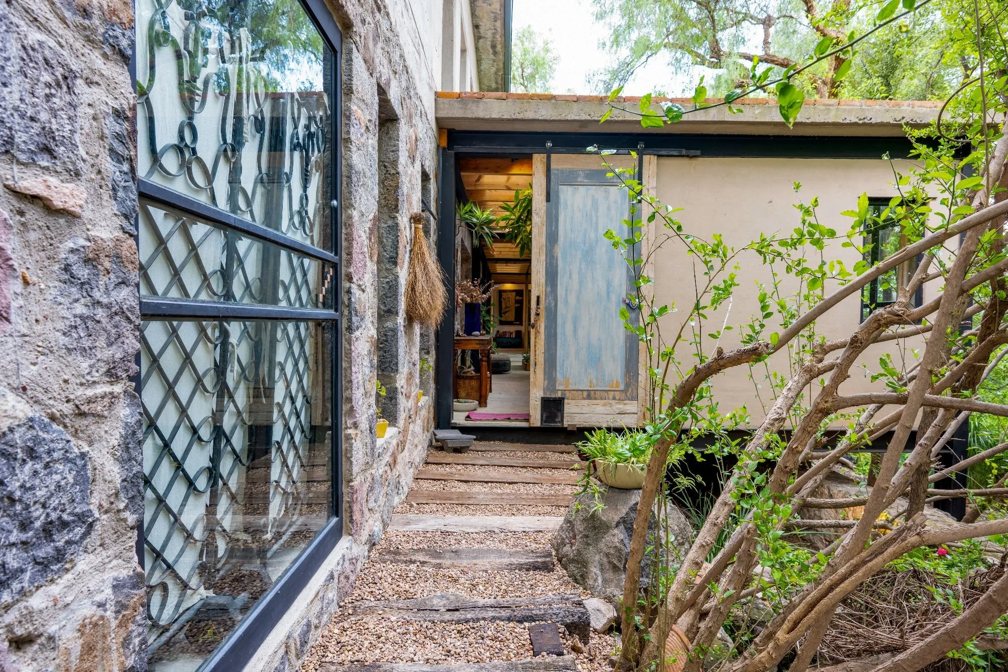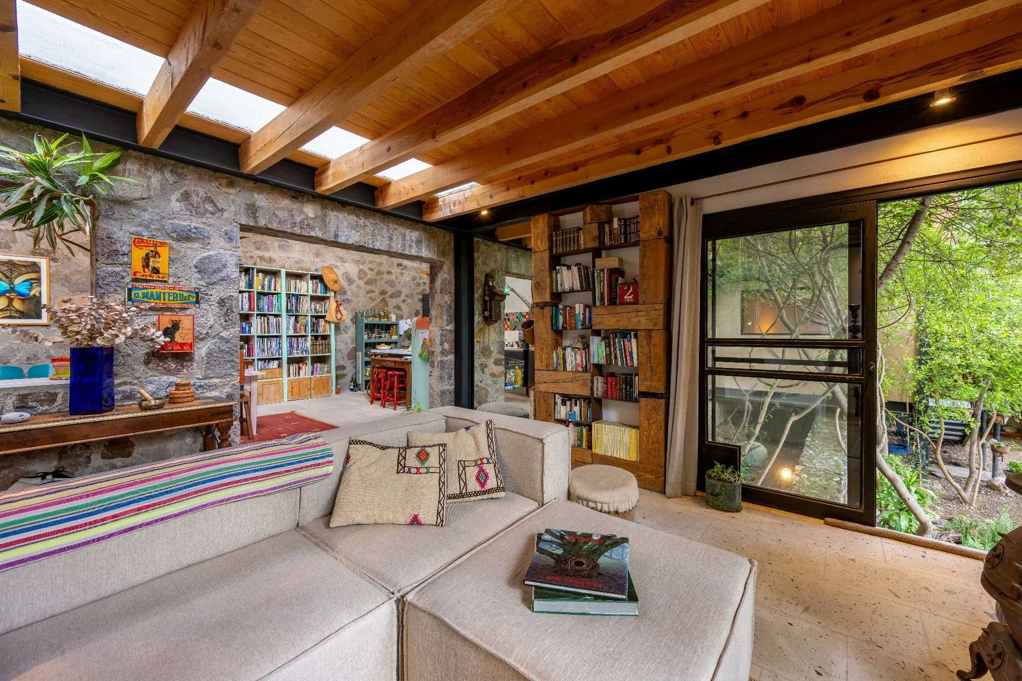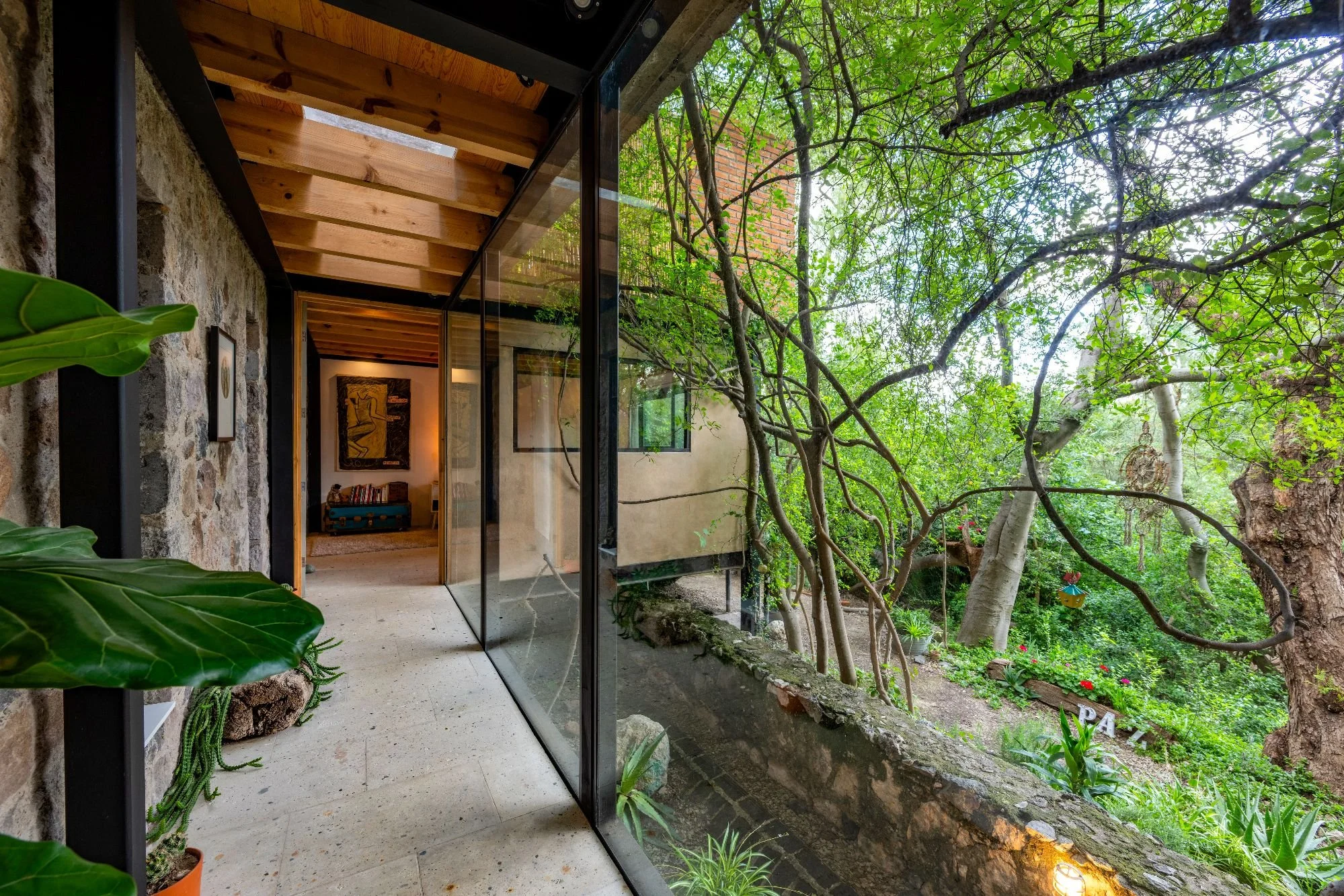 The main single-level home is bathed in natural light, with large windows, cantera floors, stone finishes, and skylights that connect indoor spaces with the surrounding greenery. It includes an open-concept living room, dining area, kitchen, and a half-bath. The master suite offers a private sitting area, a full bathroom, and an intimate terrace. Additionally, an exterior guest room with its own bath opens to the lush garden. Outdoor amenities include a fire pit, barbecue, greenhouse, and multiple gathering areas, creating an ideal sanctuary for relaxation and entertainment. Originally built in 2011 and expanded in 2023, Casa Carrizo reflects the sustainable and artistic vision of Mónica Ramírez Valerio.