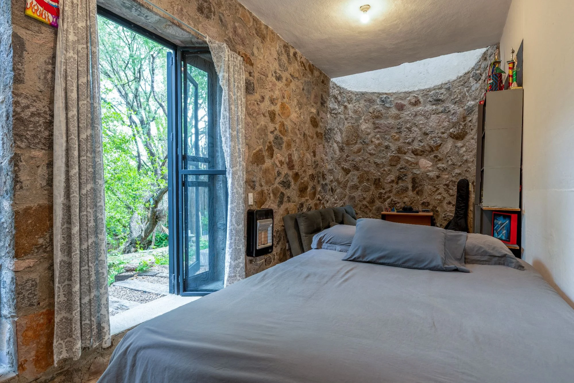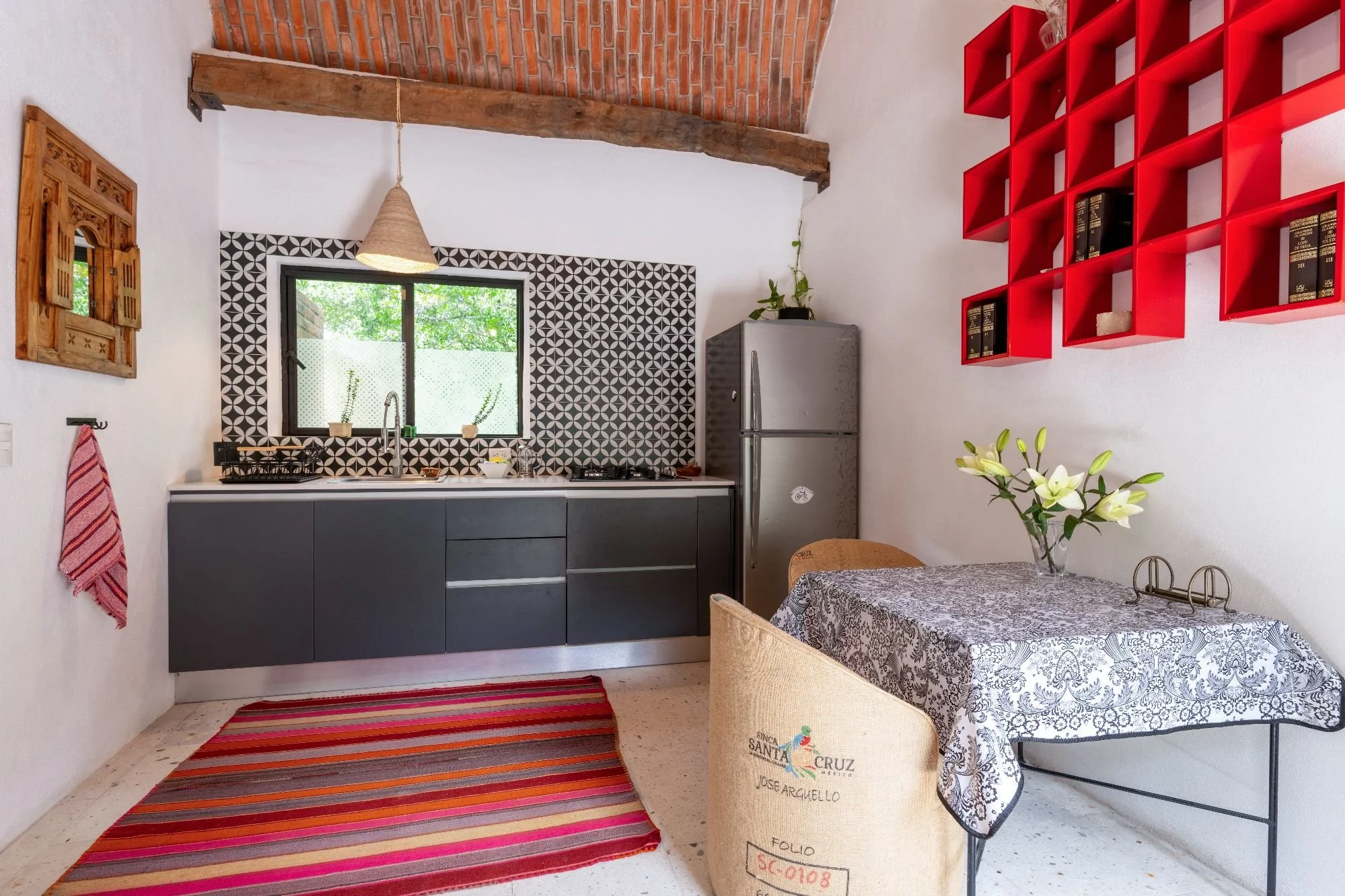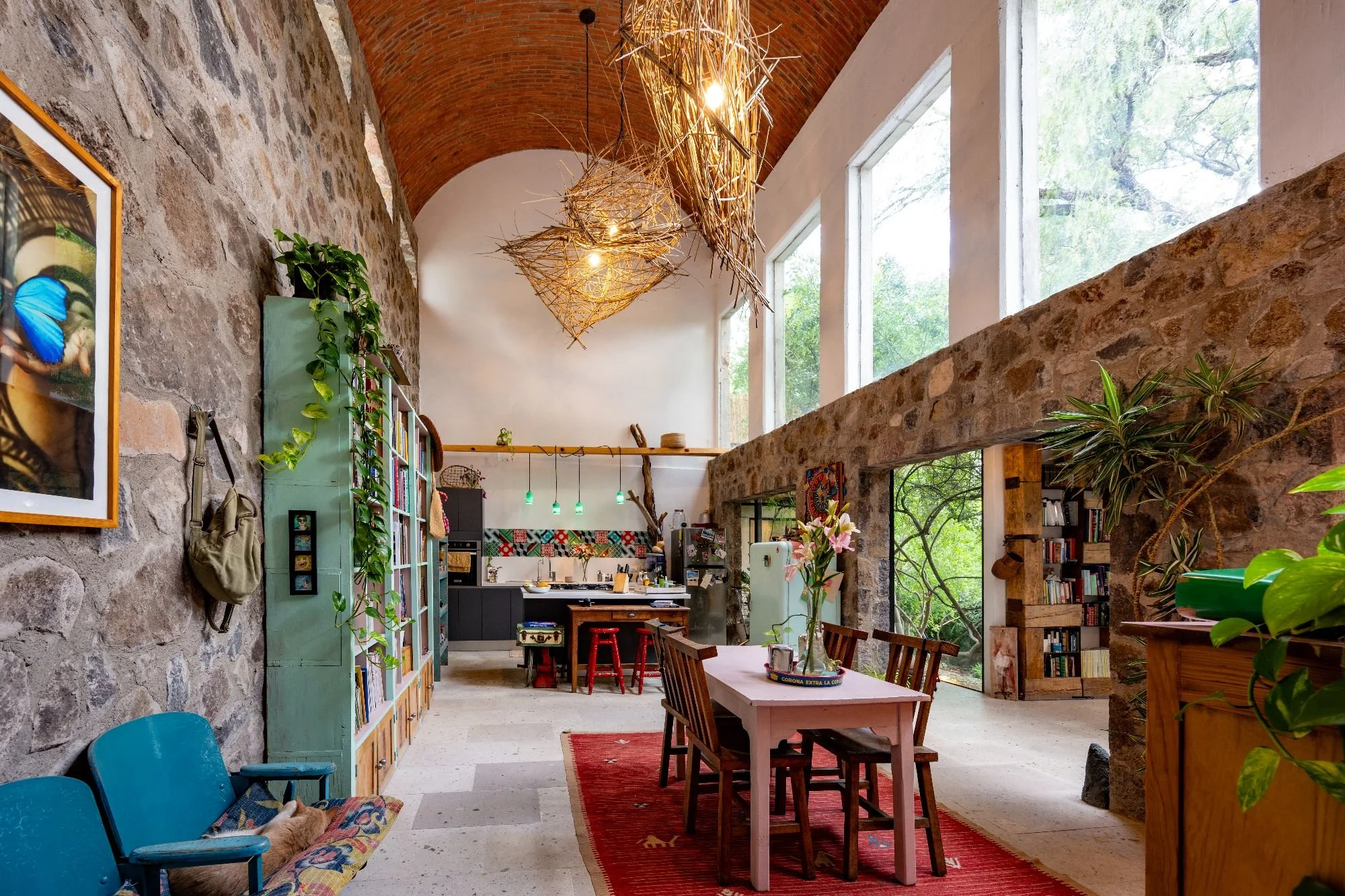 The main single-level home is bathed in natural light, with large windows, cantera floors, stone finishes, and skylights that connect indoor spaces with the surrounding greenery. It includes an open-concept living room, dining area, kitchen, and a half-bath. The master suite offers a private sitting area, a full bathroom, and an intimate terrace. Additionally, an exterior guest room with its own bath opens to the lush garden. Outdoor amenities include a fire pit, barbecue, greenhouse, and multiple gathering areas, creating an ideal sanctuary for relaxation and entertainment. Originally built in 2011 and expanded in 2023, Casa Carrizo reflects the sustainable and artistic vision of Mónica Ramírez Valerio.