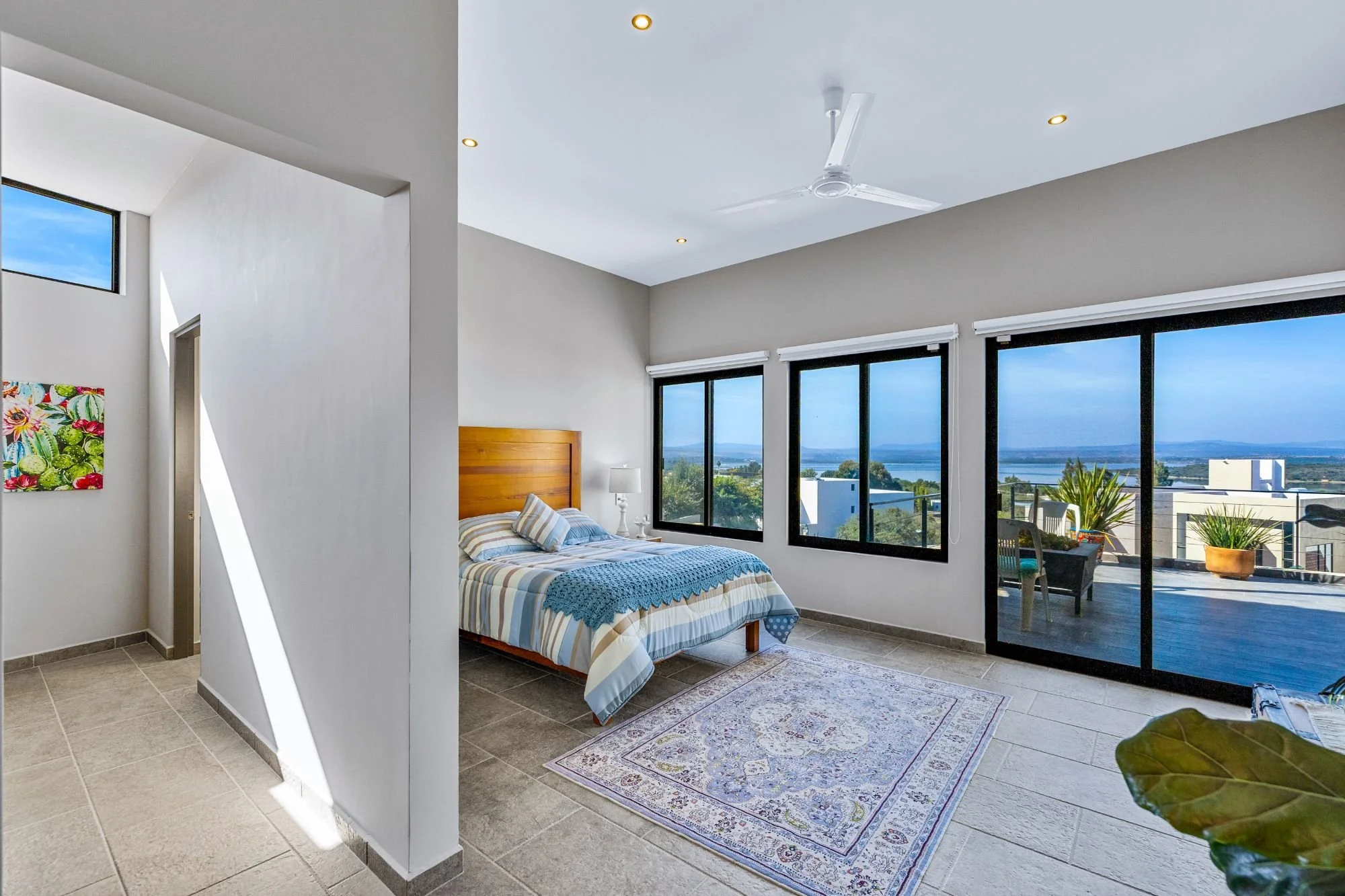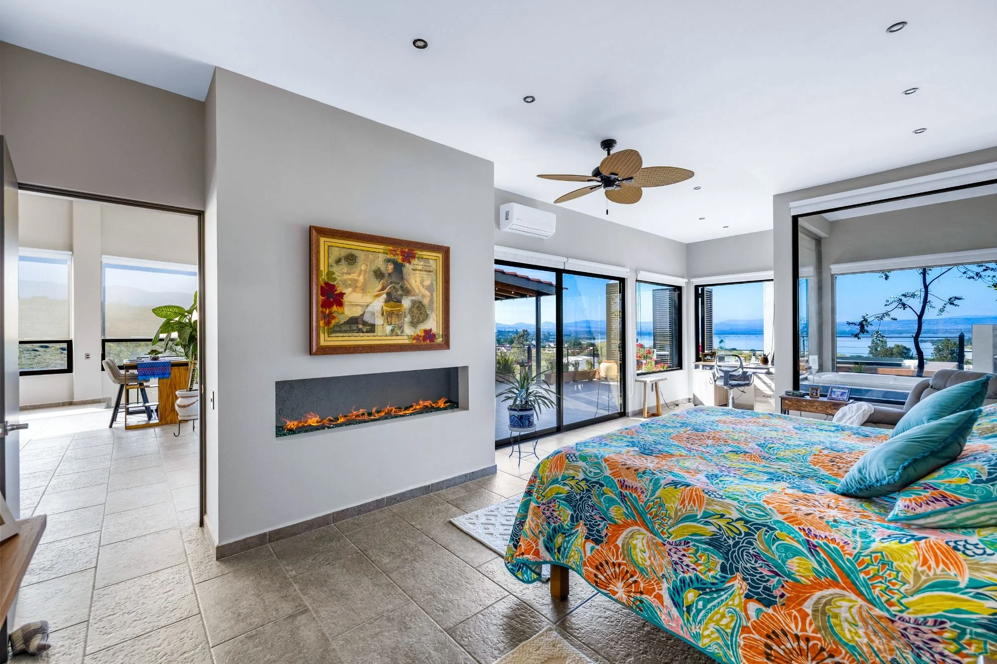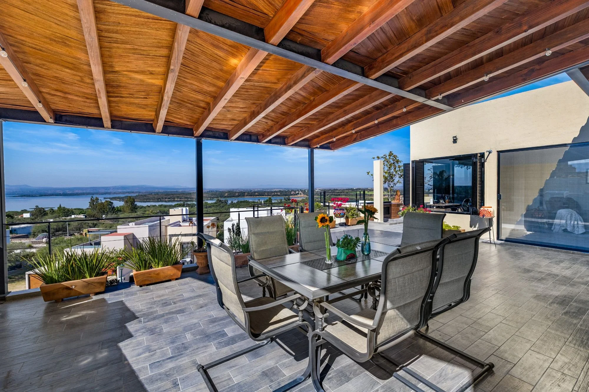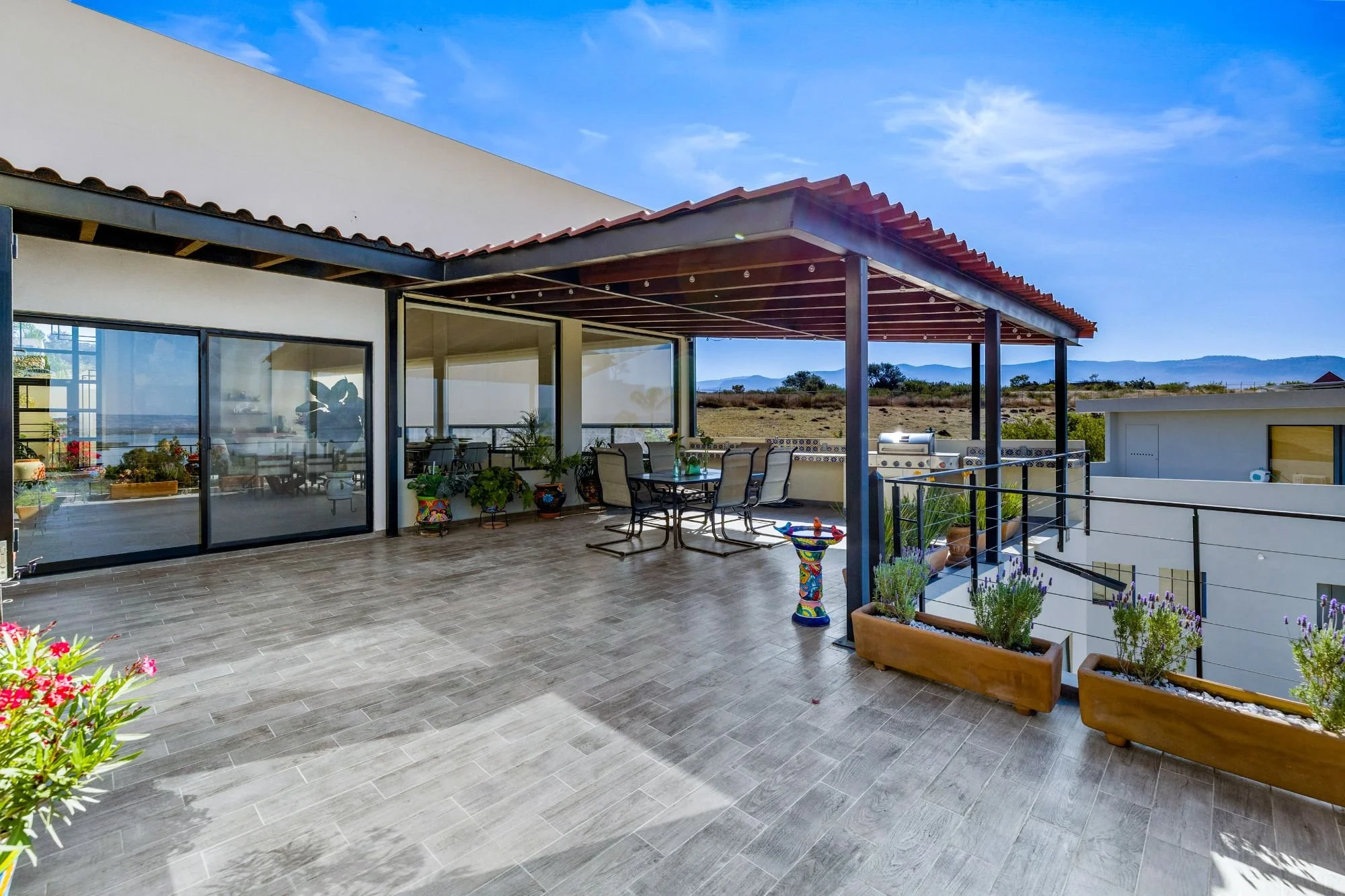 The rooftop terrace with jacuzzi delivers dramatic panoramas, while the flowing interiors create a seamless connection to the outdoors. The lower level hosts two guest bedrooms with en-suite baths and a shared terrace, alongside an independent casita with its own access, kitchenette, living space, and additional bedrooms—ideal for guests or multigenerational living.