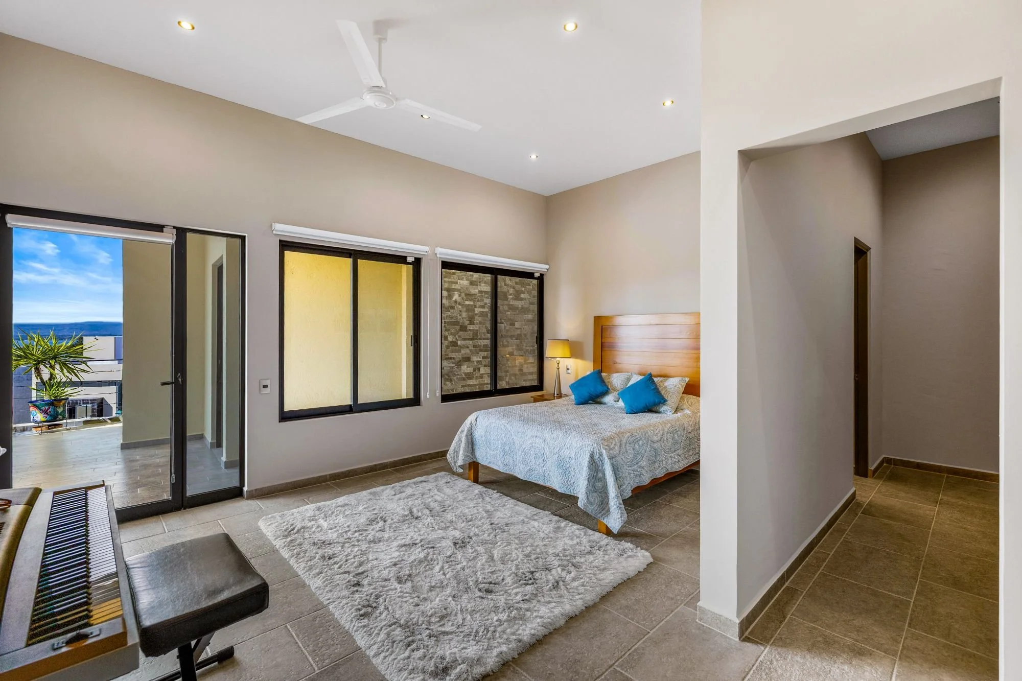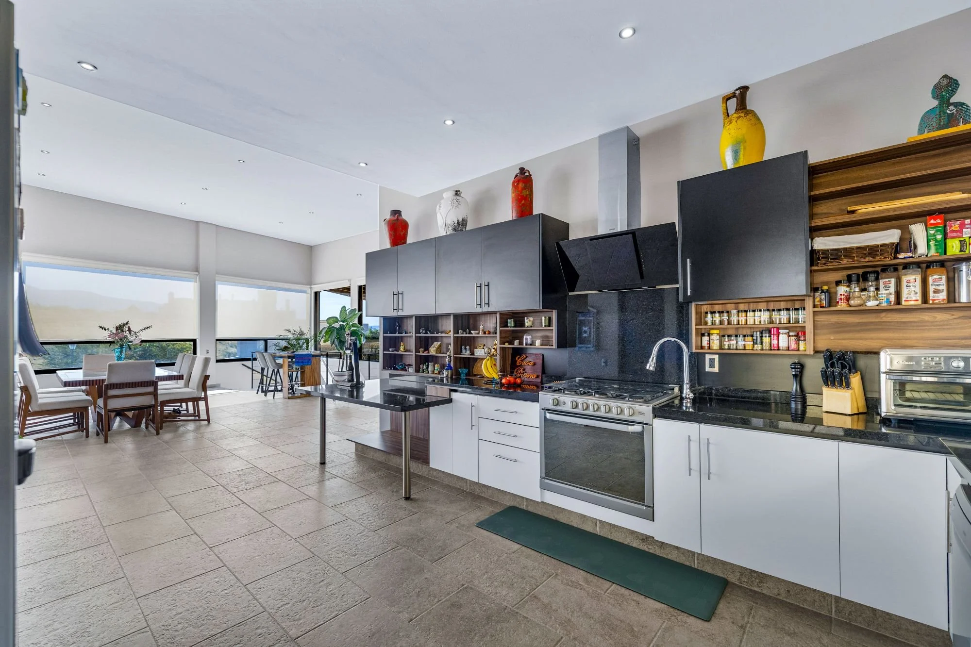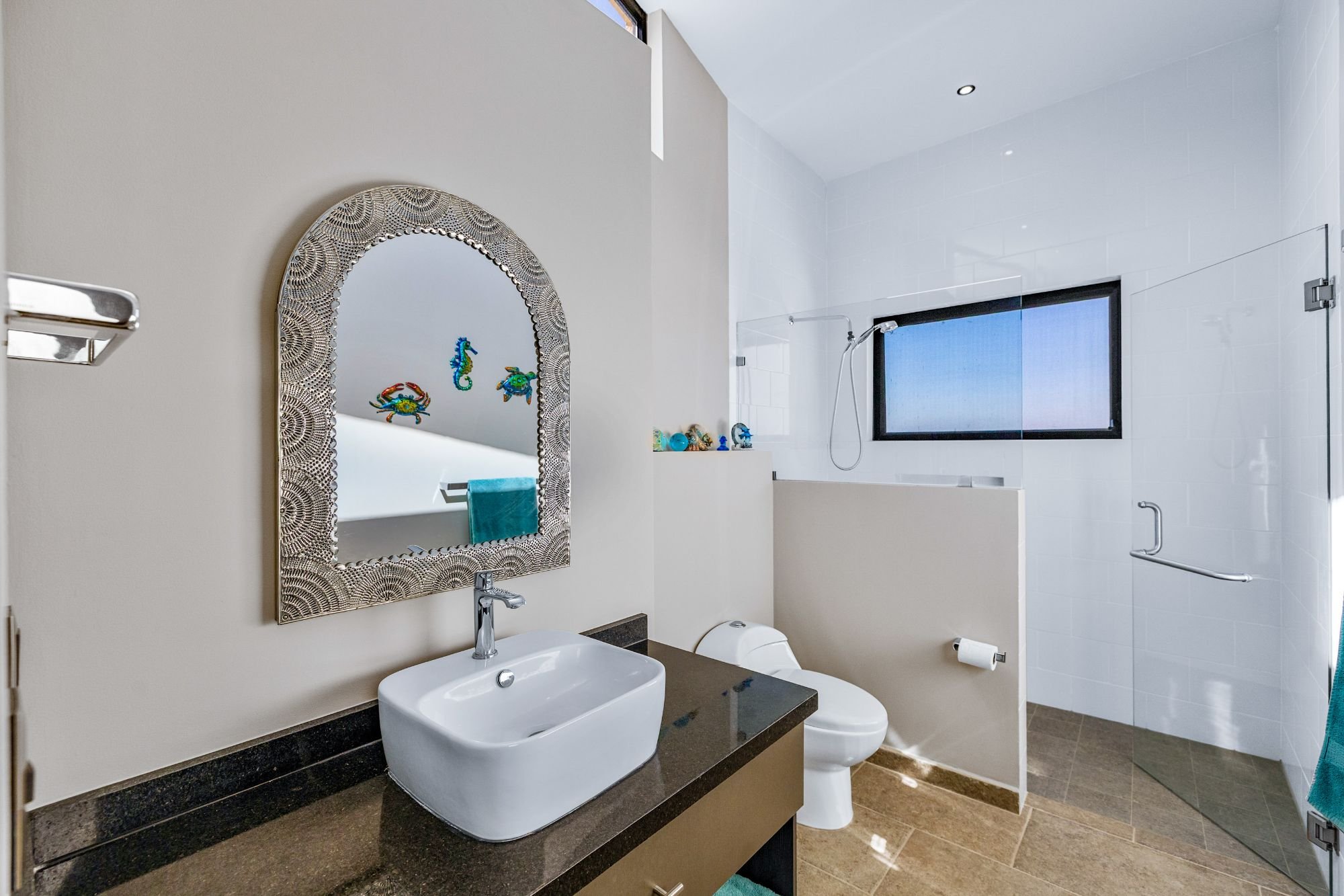 The rooftop terrace with jacuzzi delivers dramatic panoramas, while the flowing interiors create a seamless connection to the outdoors. The lower level hosts two guest bedrooms with en-suite baths and a shared terrace, alongside an independent casita with its own access, kitchenette, living space, and additional bedrooms—ideal for guests or multigenerational living.
