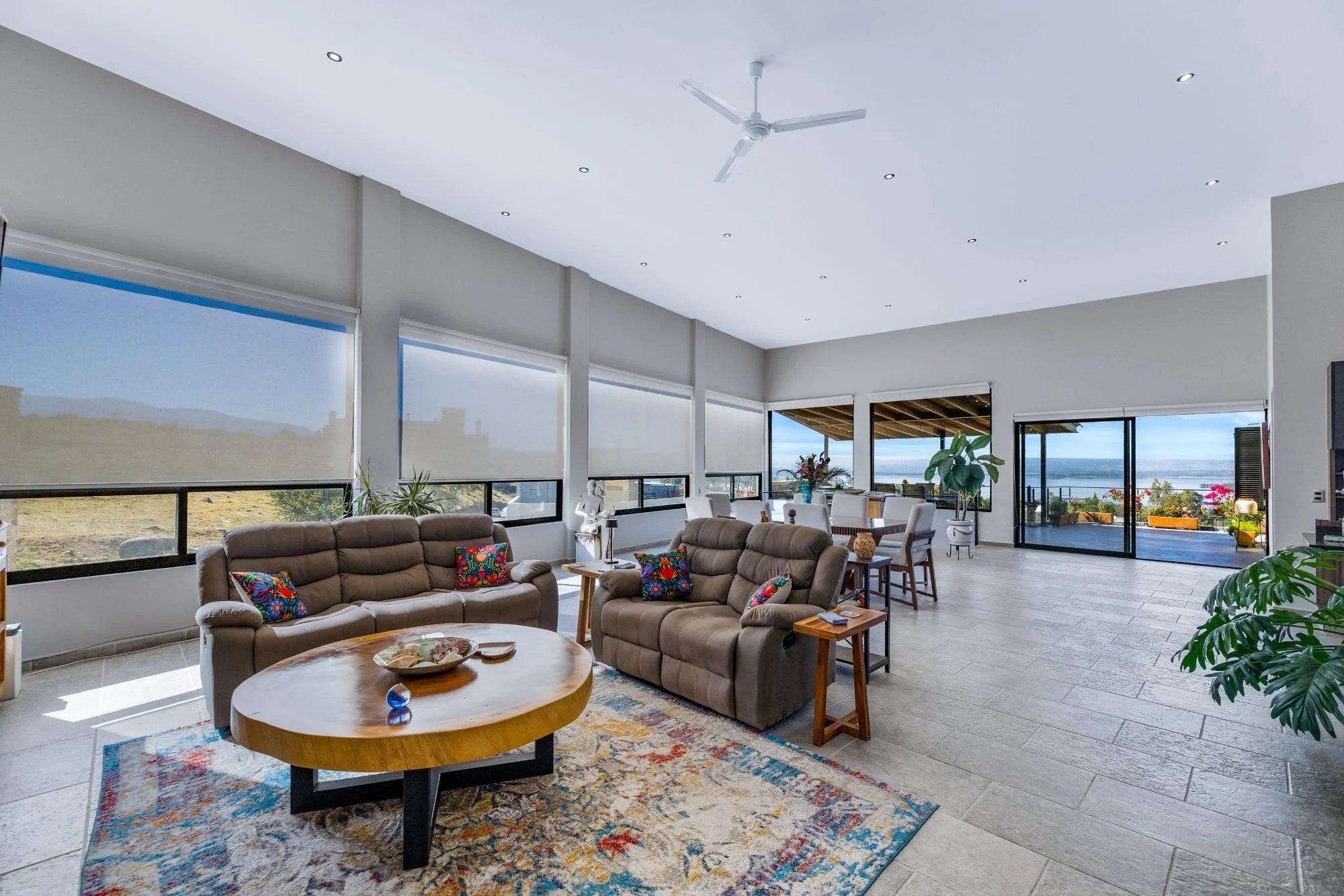 Luxury living room with panoramic windows and lake views