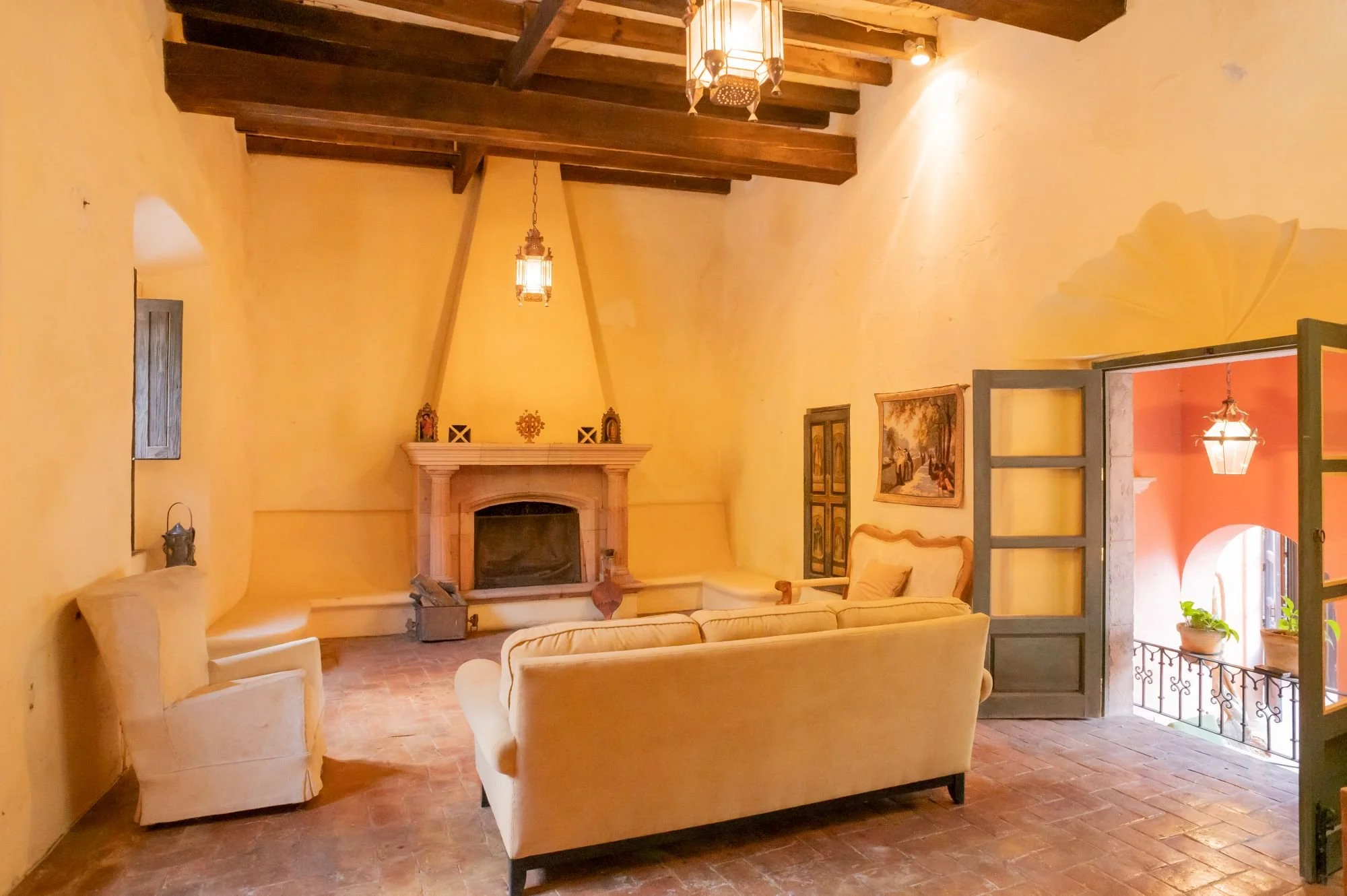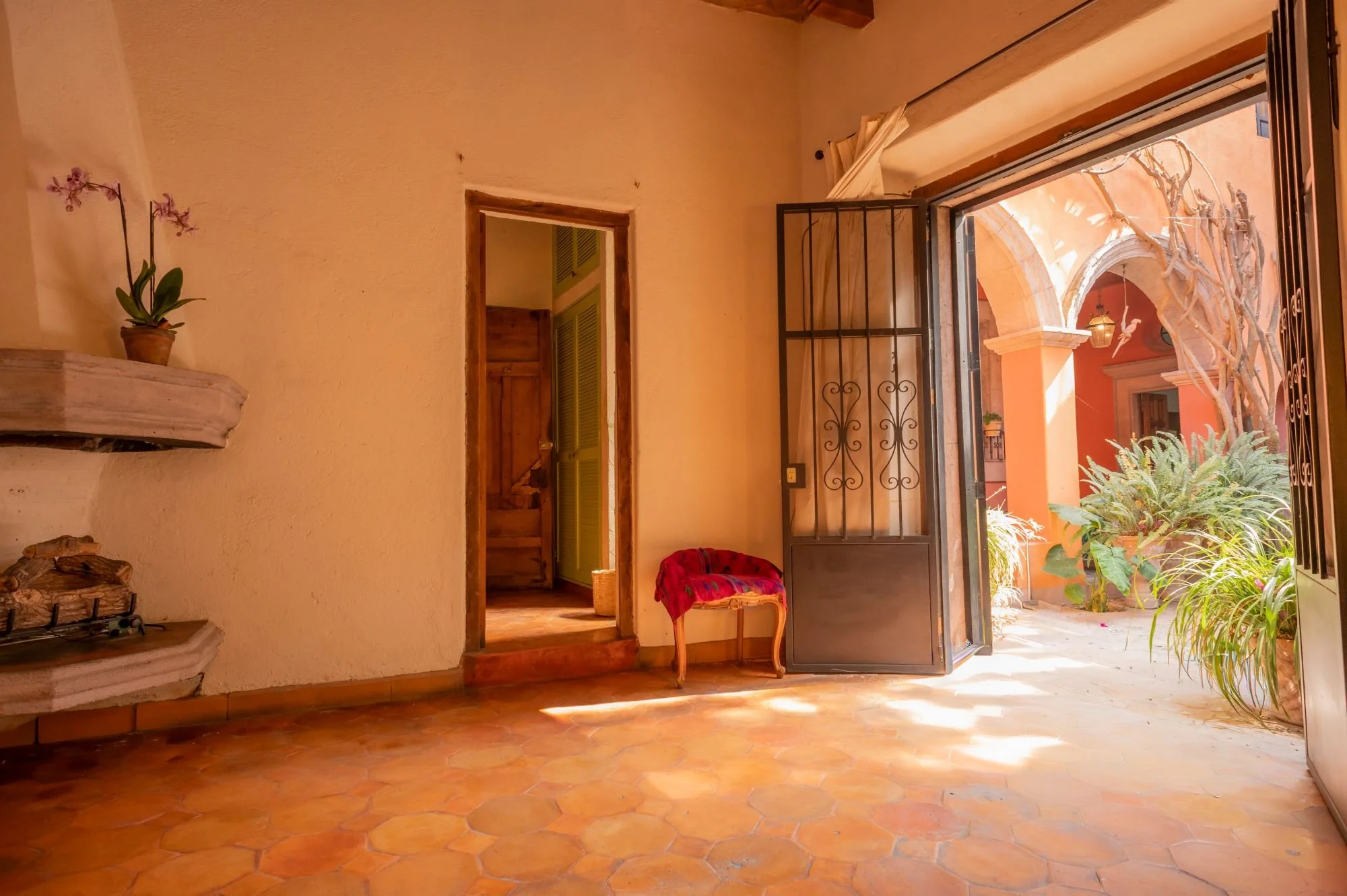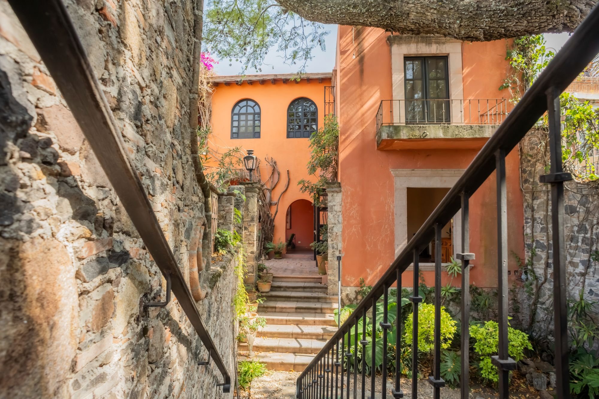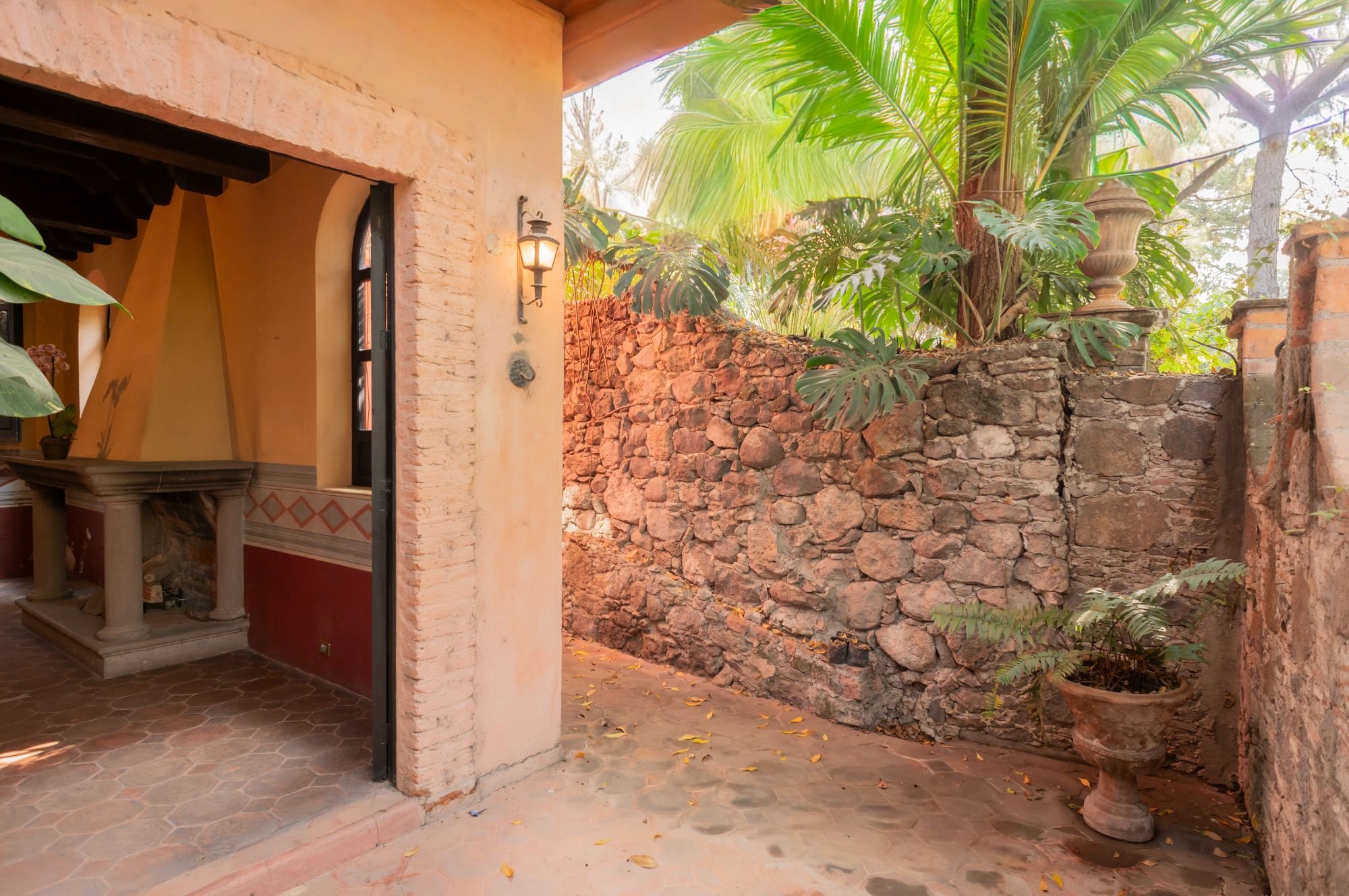 Casa Jade is a breathtaking colonial residence in the heart of San Miguel de Allende, blending classic Mexican architecture with a serene, private ambiance. Located on one of Centro’s most charming cobblestone streets, just steps from the Cultural Center and Juárez Park, this home offers an unparalleled setting. The residence features hand-carved wooden doors, lush courtyards, and stone walls accented with cantera arches and terracotta tones. A traditional-tile fountain anchors the main courtyard, while the covered terrace serves as the social heart, ideal for entertaining or relaxing. The primary bedroom is on the main floor, with two additional bedrooms upstairs that enjoy private terraces and scenic views. A separate casita provides independent guest accommodations. With abundant natural light and seamless indoor-outdoor living, Casa Jade perfectly captures the essence of San Miguel de Allende.