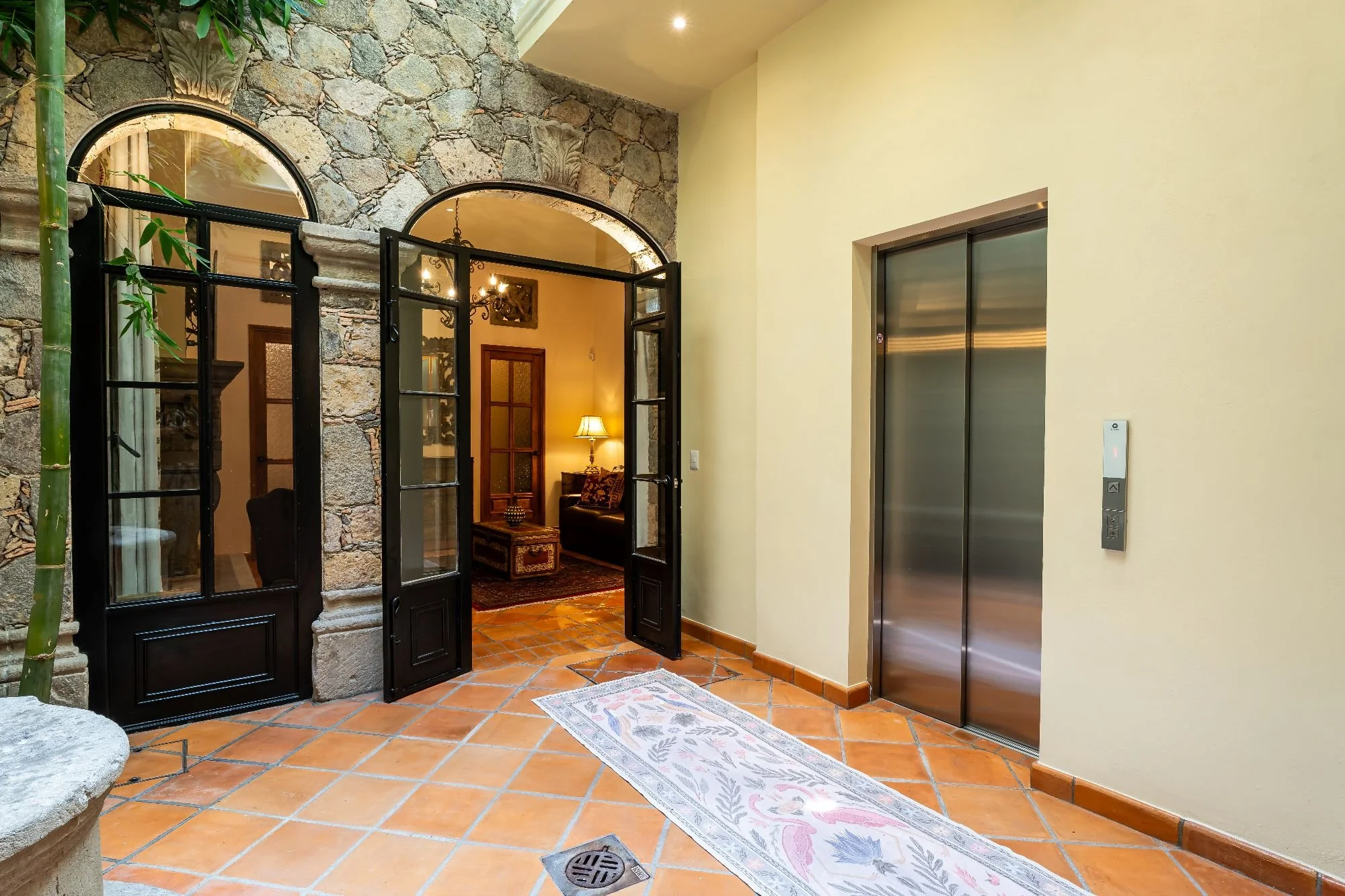 High-quality finishes and thoughtful details enhance its charm, while the premium German Schindler elevator ensures ease of access across all levels. A rooftop terrace with a half bathroom invites you to enjoy relaxing afternoons or social gatherings with scenic views of Centro and the Parroquia. Additional highlights include a custom-built kitchen, water filtration system, fountains, and air conditioning. Perfect as a primary residence or an excellent rental opportunity in one of San Miguel de Allende’s most desirable neighborhoods.