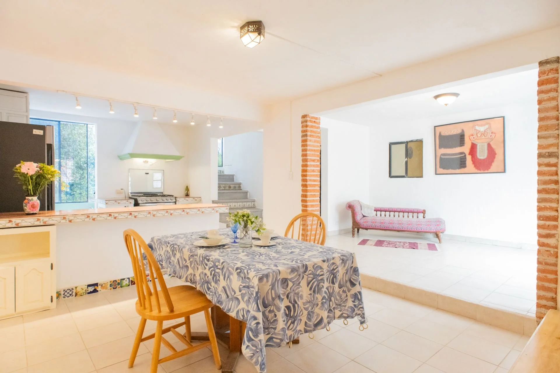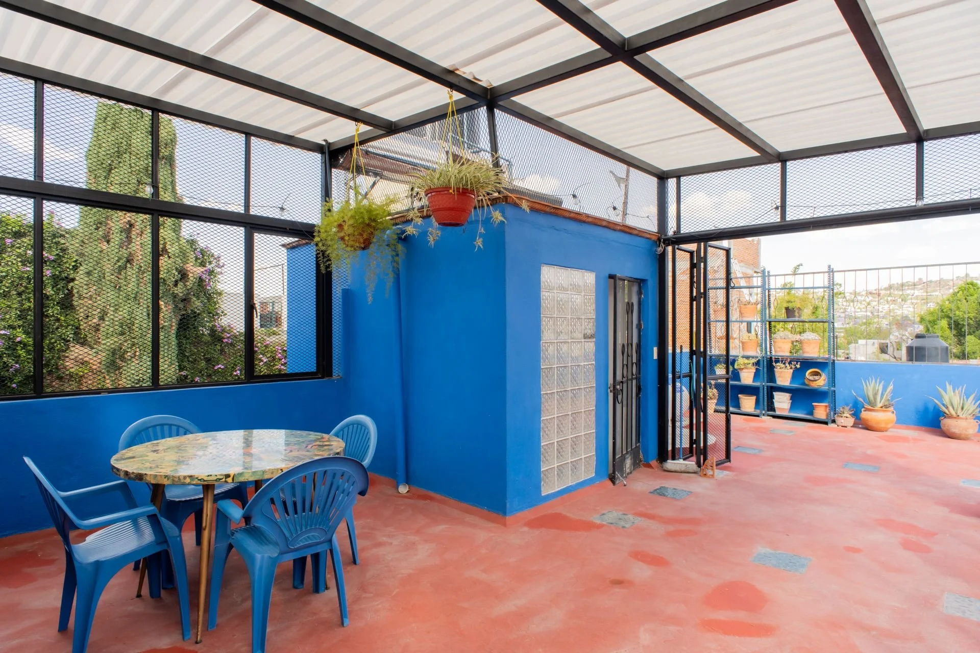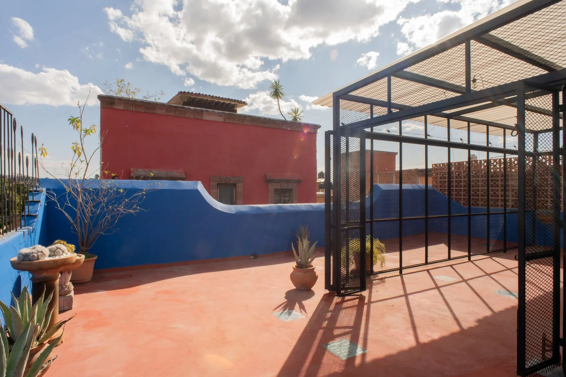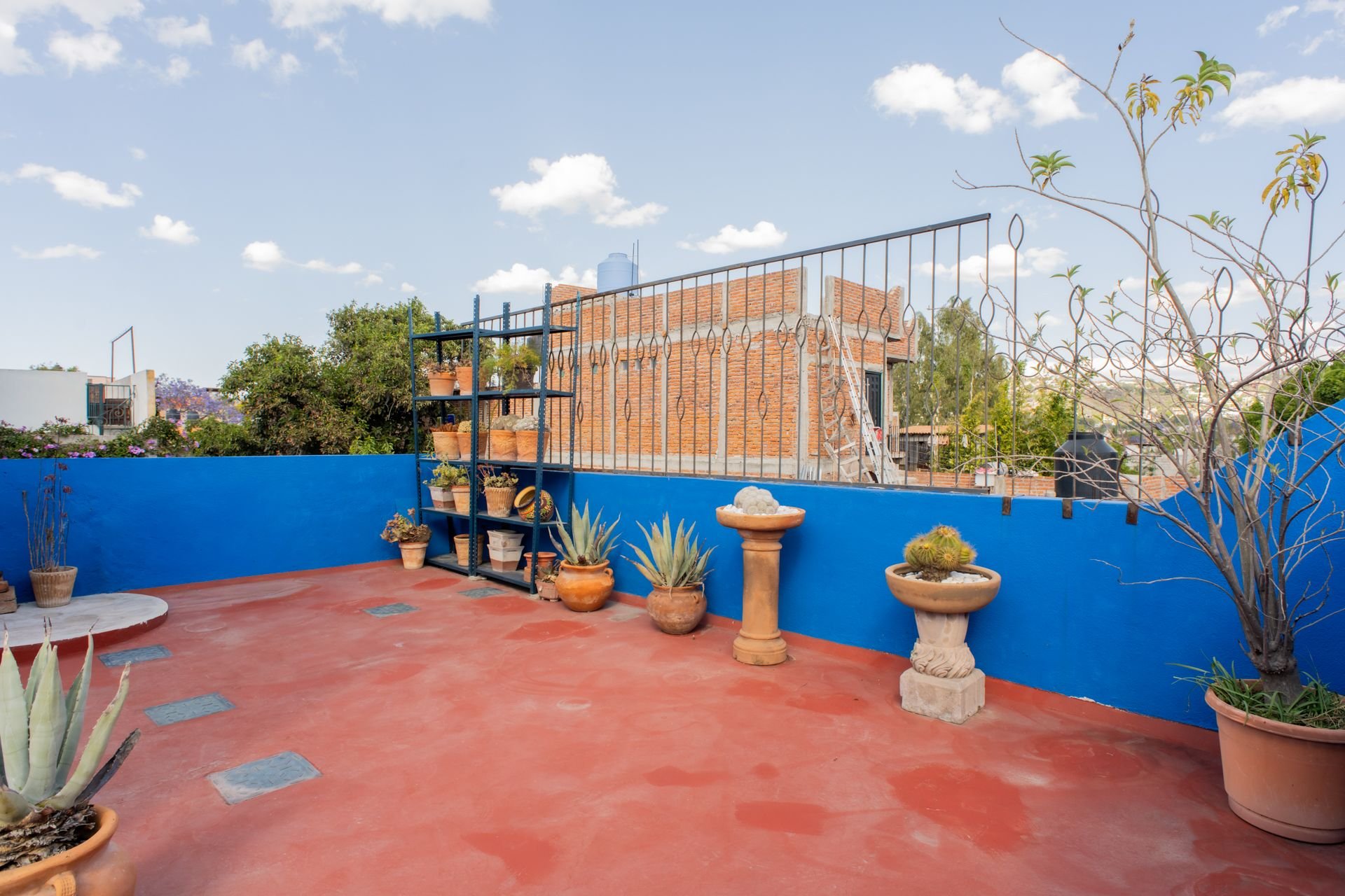 Casa Santuario is a beautifully reimagined two-story traditional Mexican home in San Miguel de Allende, offering a perfect blend of classic craftsmanship and artistic style. This recently renovated residence features brick columns, hand-selected Talavera tiles, crisp white ceramic floors, and custom wrought-iron details throughout. Natural light enhances the handcrafted textures, creating a warm and inviting atmosphere. The open-concept living and dining area flows seamlessly into a spacious kitchen adorned with hand-painted cabinets and artisanal finishes. A lush landscaped garden with vibrant hibiscus and a forty-year-old cypress tree provides a serene private retreat. The property includes a newly built single-level casita with a private entry and rooftop terrace, ideal for guests or rental opportunities. Upstairs, the primary suite includes a private office and garden views, complemented by two guest bedrooms and a unique "Catio" rooftop enclosure. Casa Santuario offers the perfect combination of tradition, creativity, and modern comfort in the heart of San Antonio.