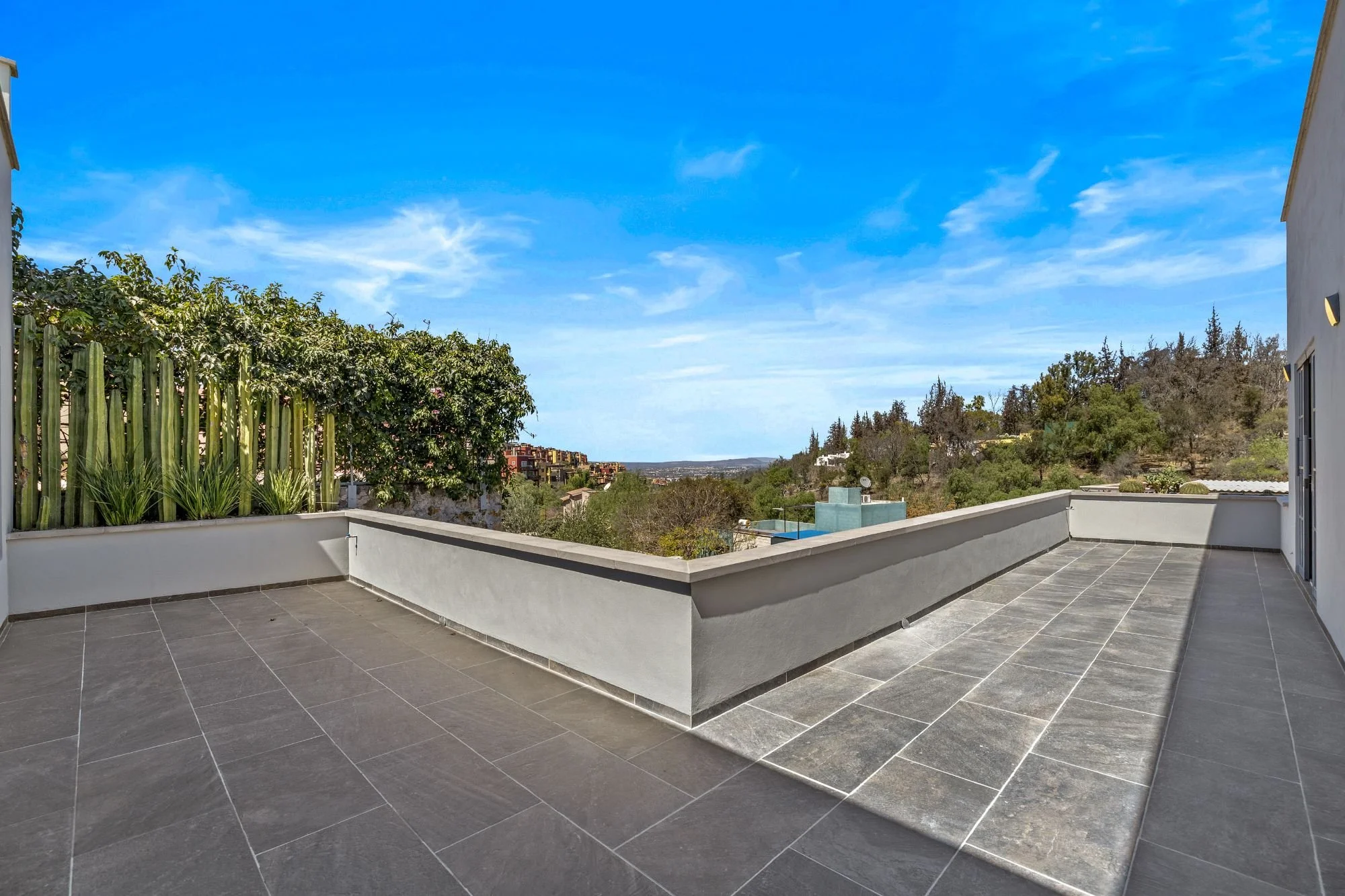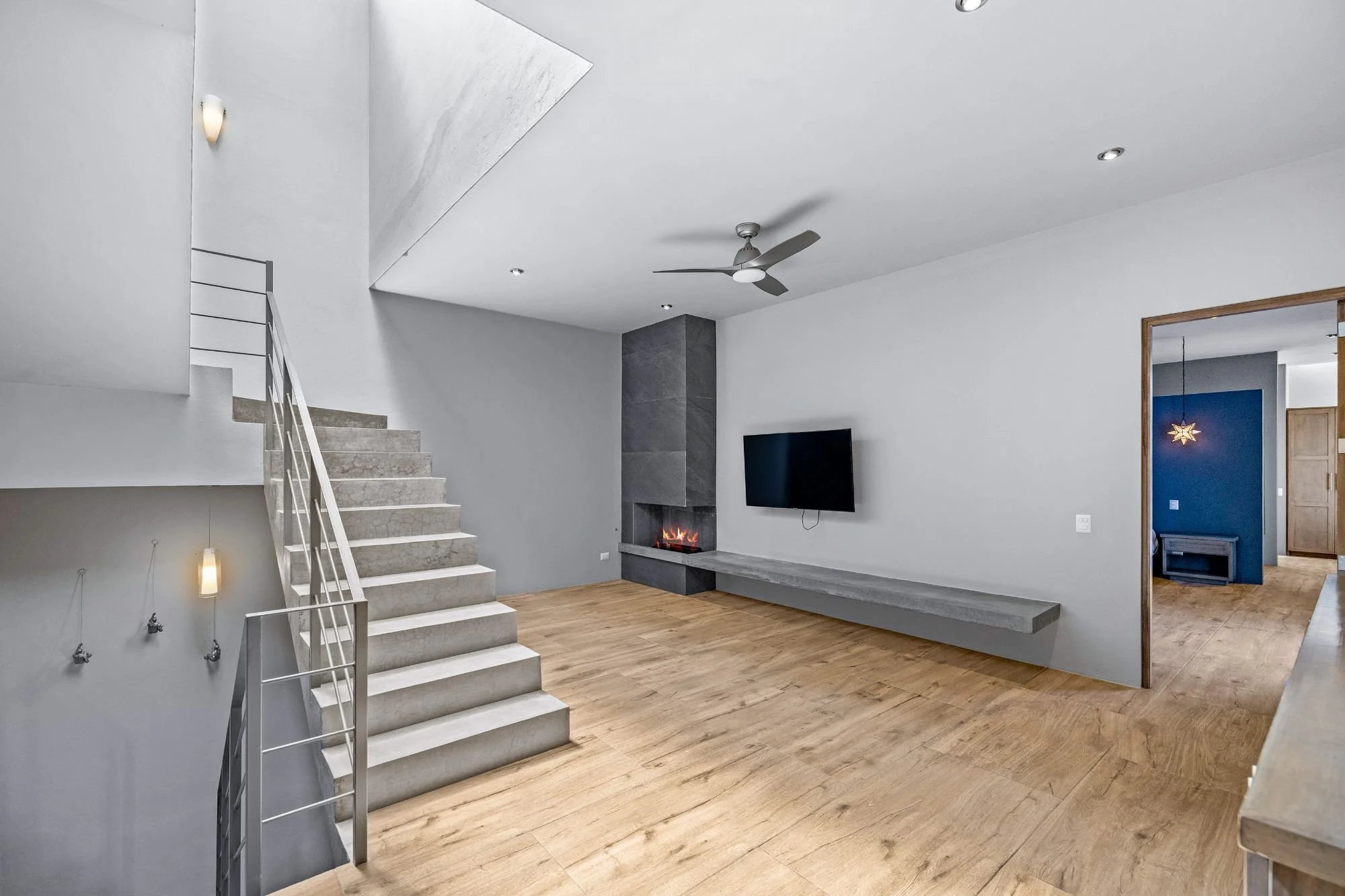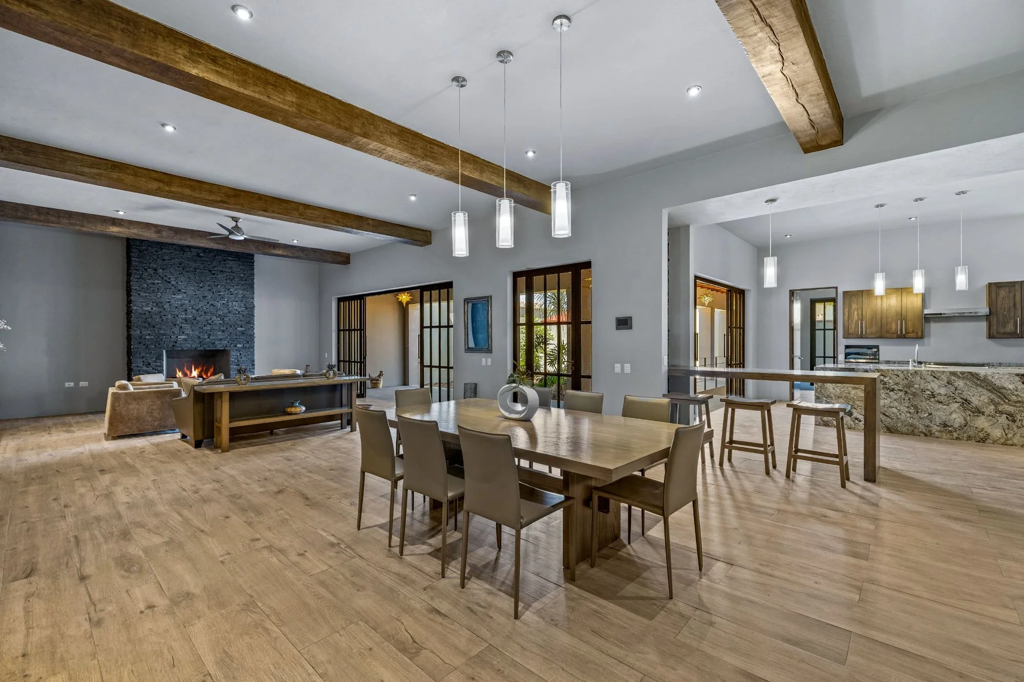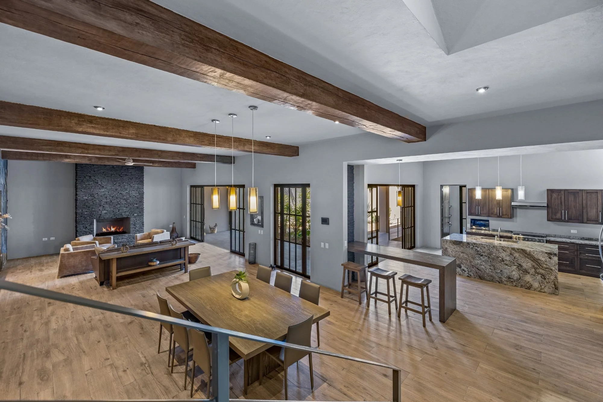 Casa San Uriel is a contemporary single-family home located in the exclusive gated community of El Paraíso, just above Centro in San Miguel de Allende. This beautifully designed residence offers the perfect balance of privacy and convenience, with quick access to Plaza La Luciérnaga, essential services, hospitals, and supermarkets. Built approximately five years ago, the home showcases clean architectural lines, refined finishes, and abundant natural light throughout its thoughtfully planned layout. The open living and dining areas are highlighted by a striking natural stone accent wall and polished concrete details, while the light-filled spaces connect seamlessly to the front garden and exterior terraces. Featuring two spacious bedroom suites with fireplaces, generous outdoor areas, and a rooftop terrace with panoramic valley and city views, Casa San Uriel creates an inviting sanctuary ideal for relaxed living and memorable entertaining.