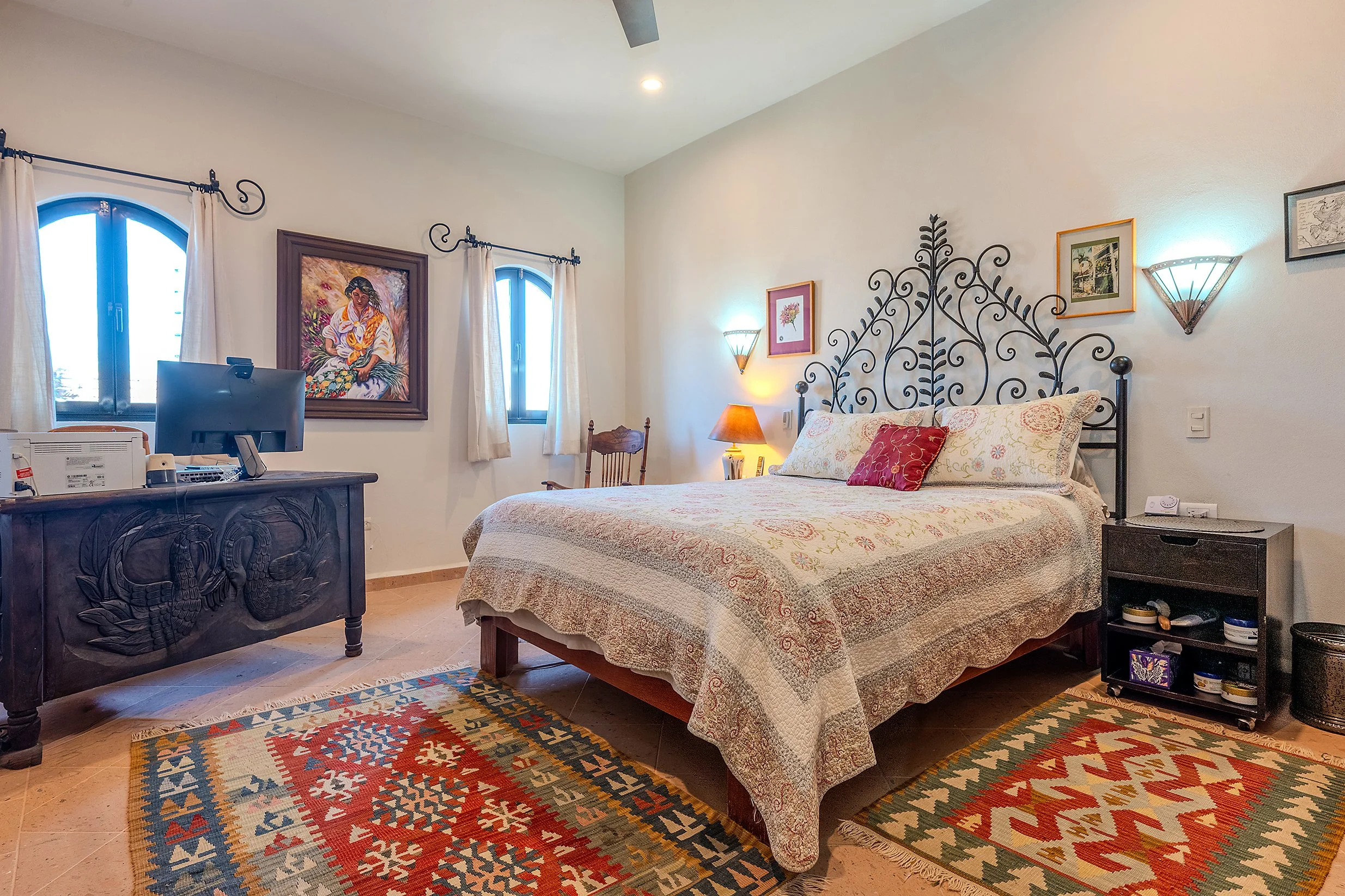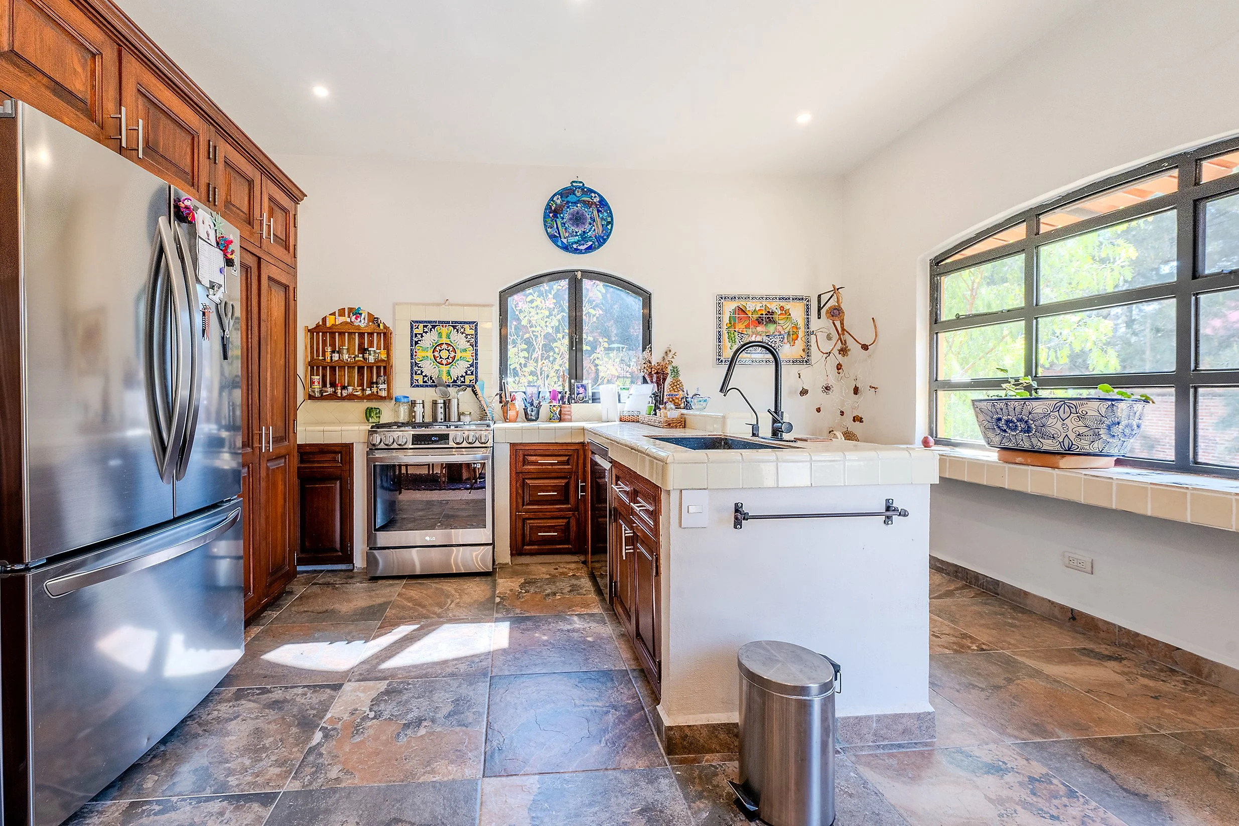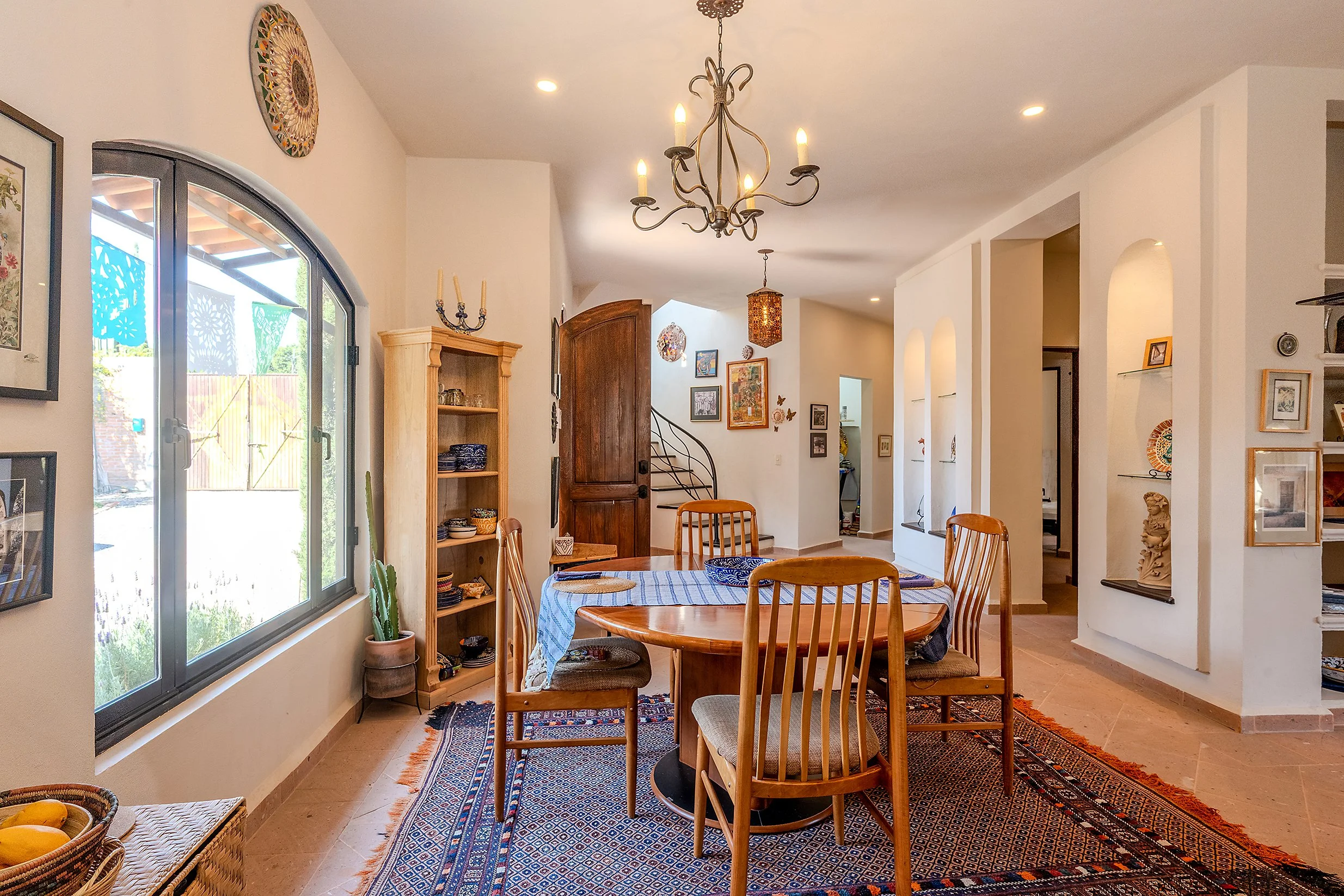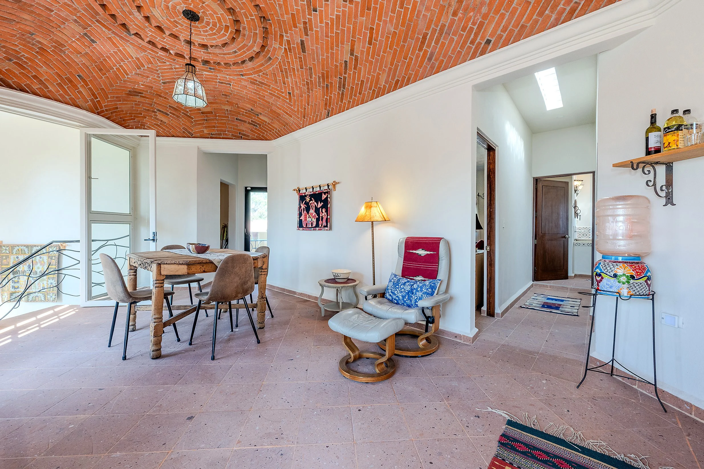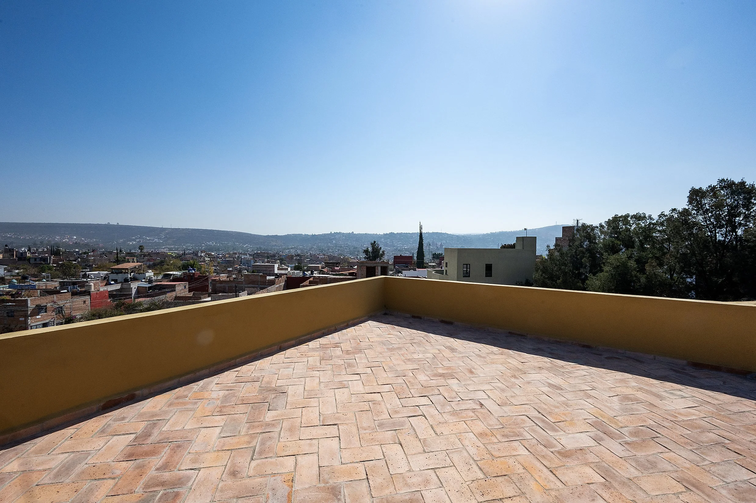From this floor, a stairway leads to the rooftop terrace, where spectacular views of San Miguel de Allende and the surrounding mountains create a standout feature of the home.