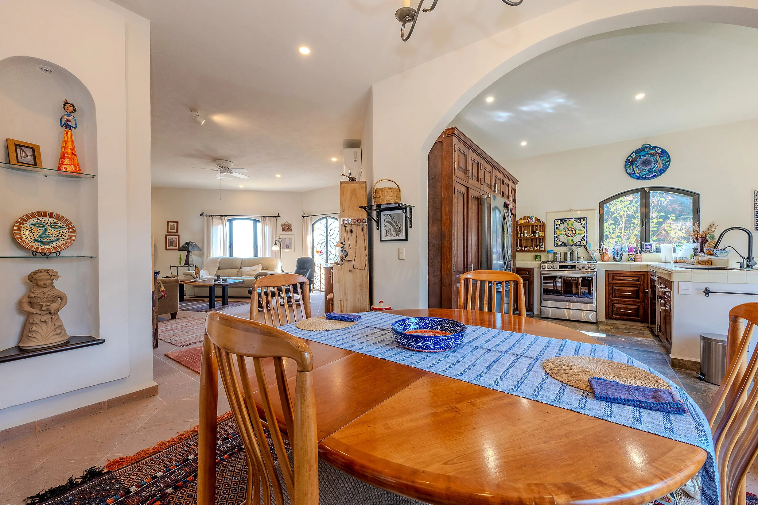 To the right, the dining room flows into an open kitchen, creating a comfortable space for everyday living and entertaining. Beyond, is a spacious living room centered on a cantera fireplace.