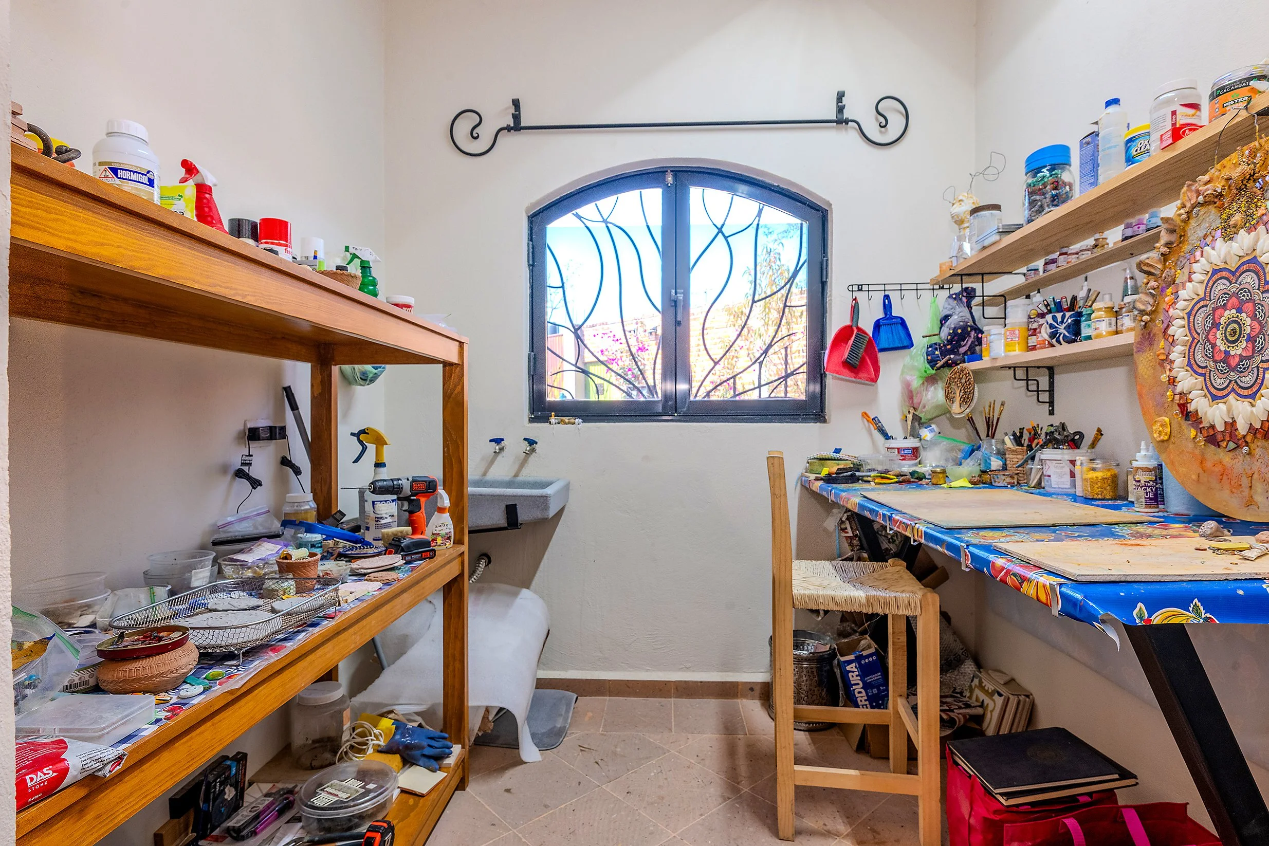 The ground floor features a generously sized primary suite with a full en-suite bath with bathtub, along with extensive custom wood cabinetry providing abundant storage and closet space. This level also includes a guest half bath, an artist’s studio, and a laundry room with direct access to the garden.