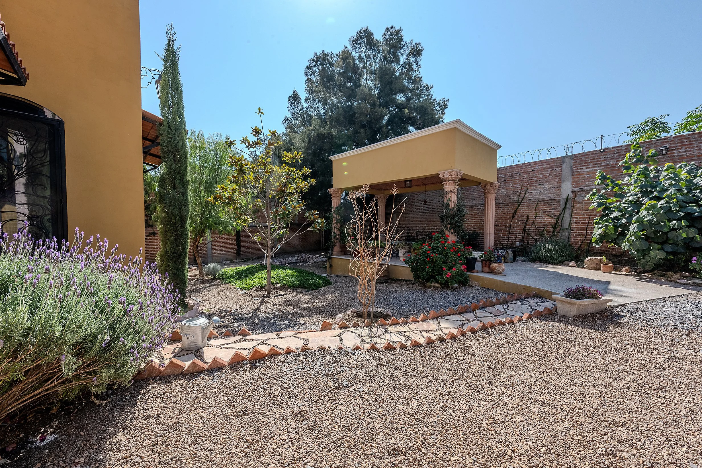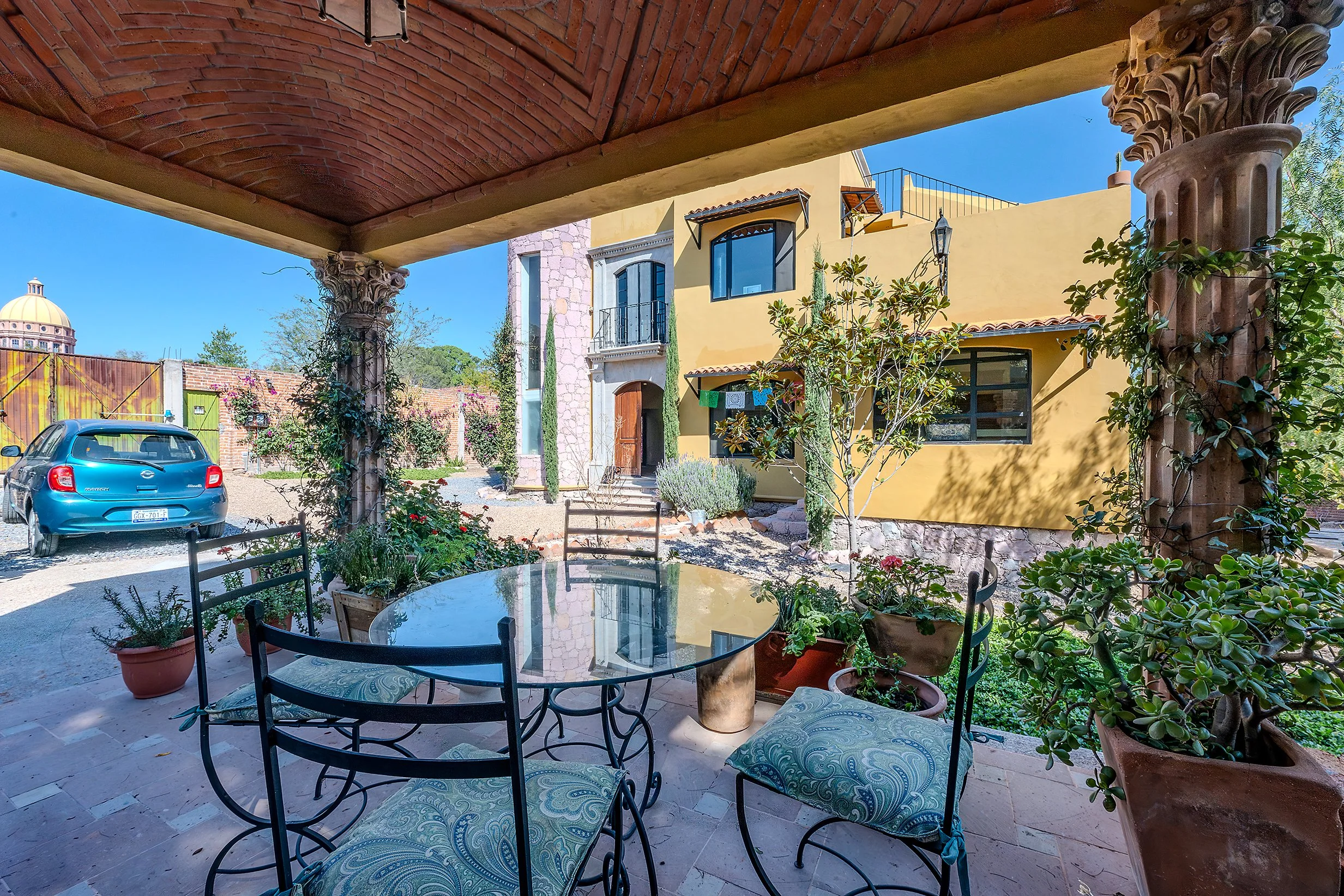 In the garden, a large covered outdoor structure supported by four cantera columns provides a beautiful shaded space currently used for outdoor dining, though it could also function as a carport.